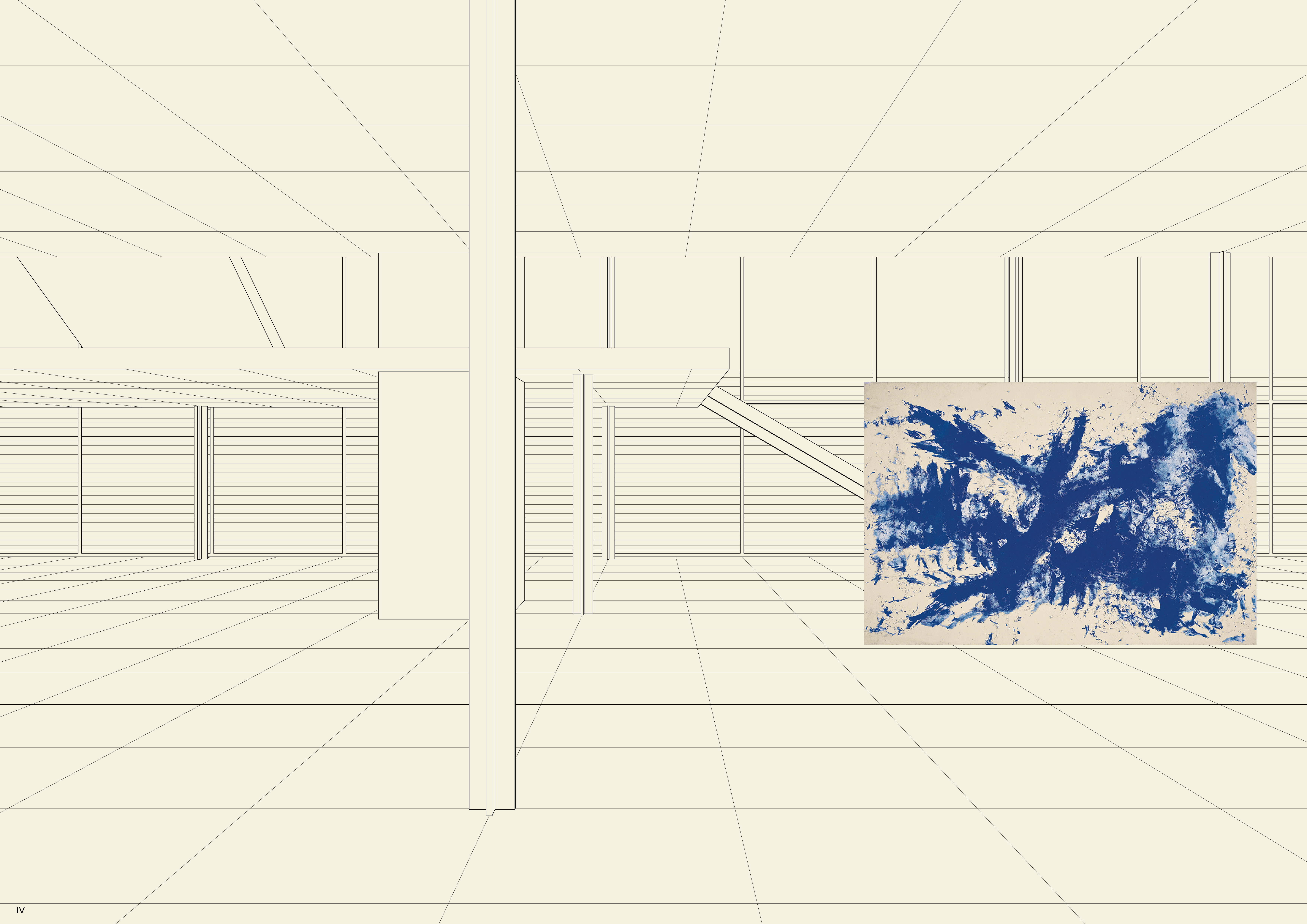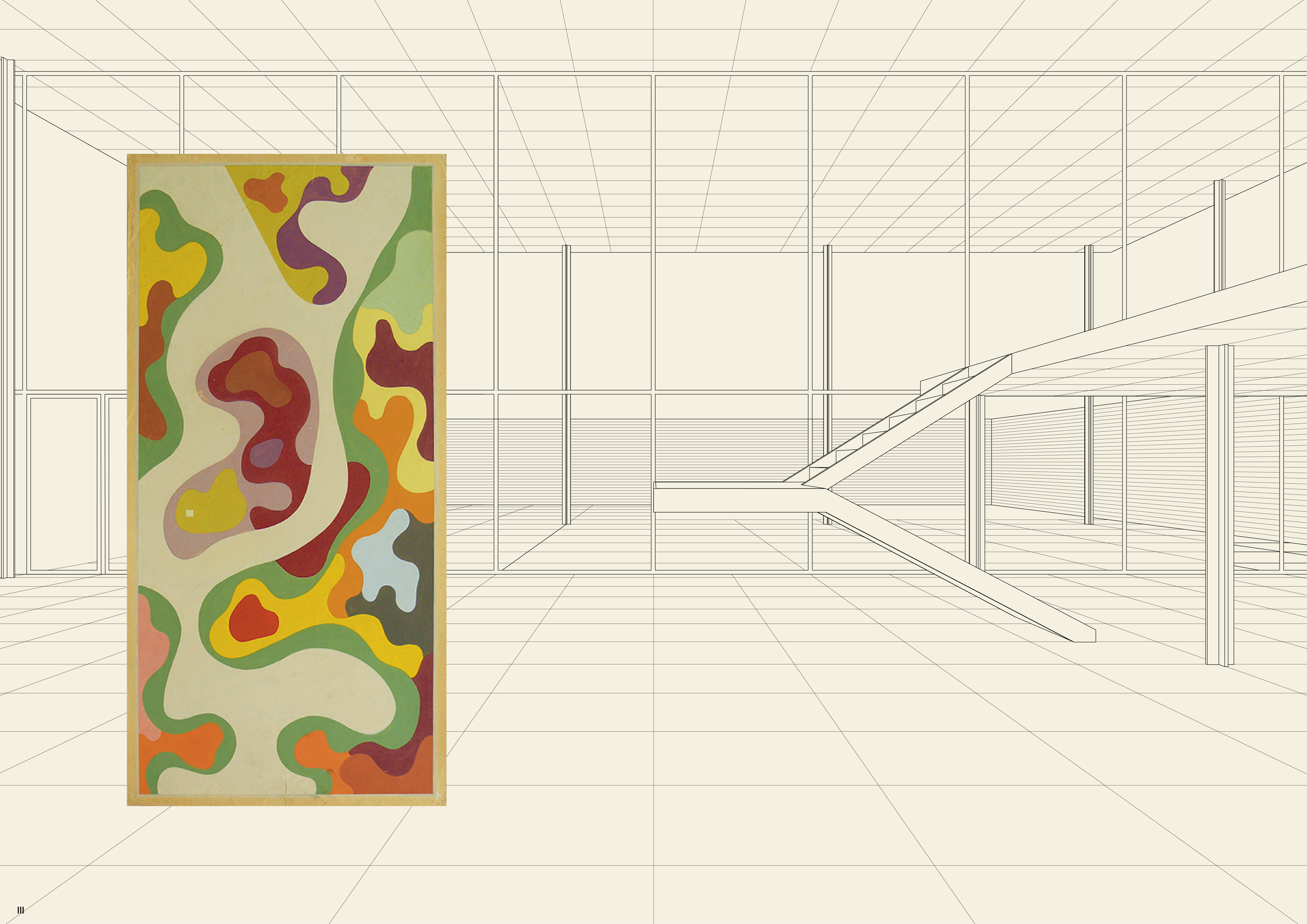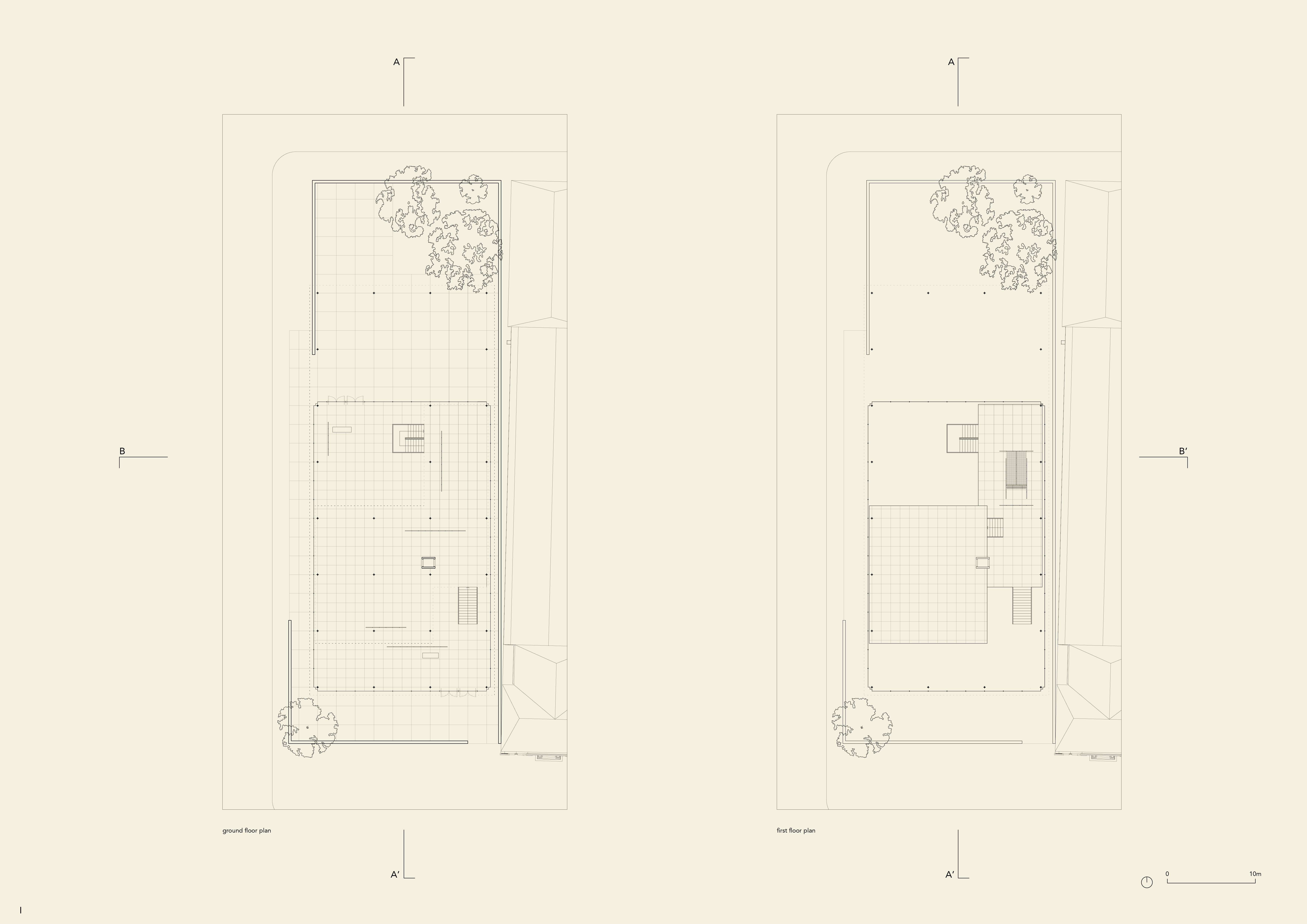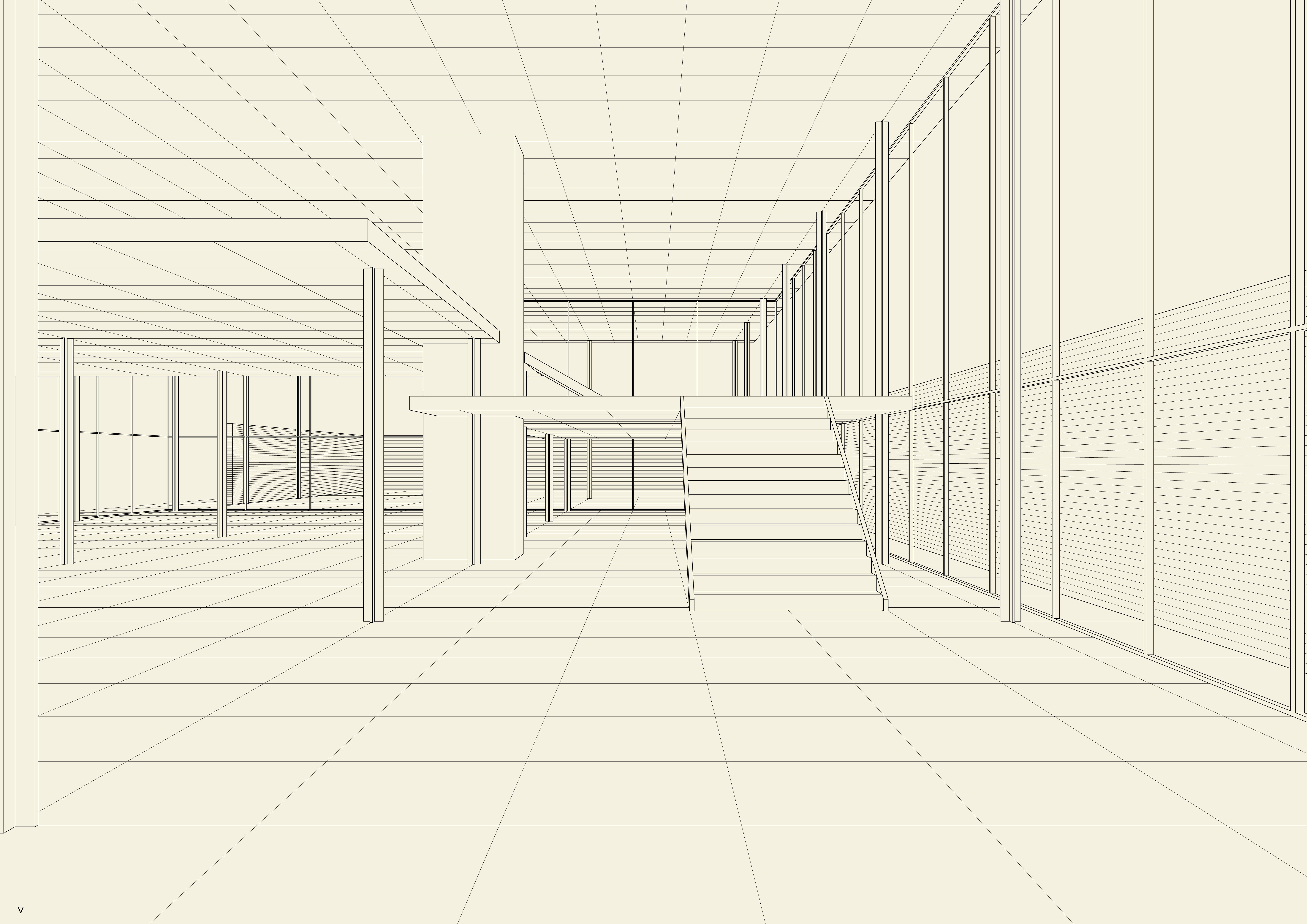 The two-way steel roof spans 3 by 7 bays, while the interior space 3 by 5 bays. The bays are 6.40 meters by 6.40 meters. All steel structure, with cruciform columns and connectors plates for the roof structure. The rigidity of the roof allows for only 4 tension cables to brace the building.