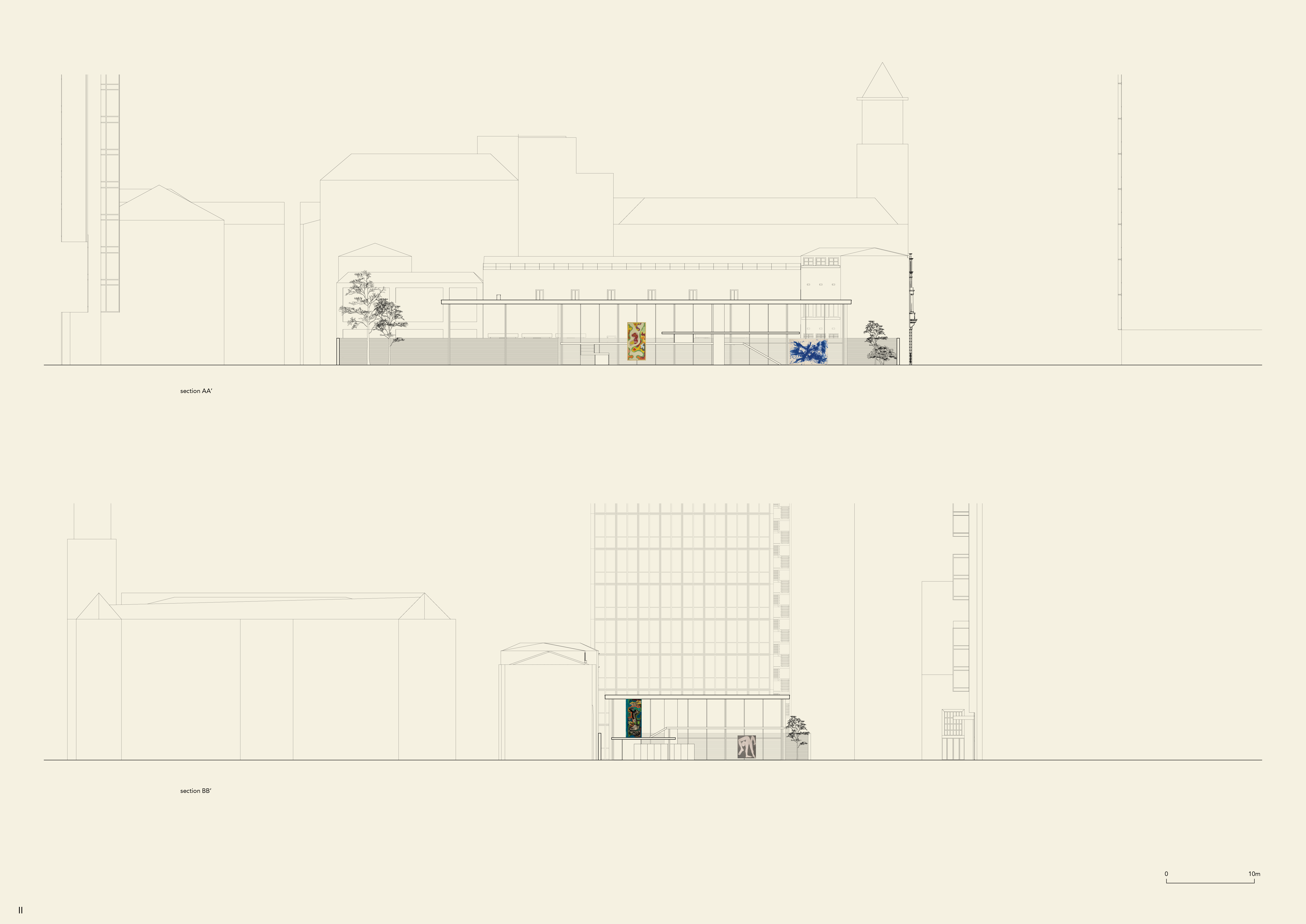 Brick walls surround the building and create two separate courtyards. A smaller one on the southside of the center, and a bigger one on the north.