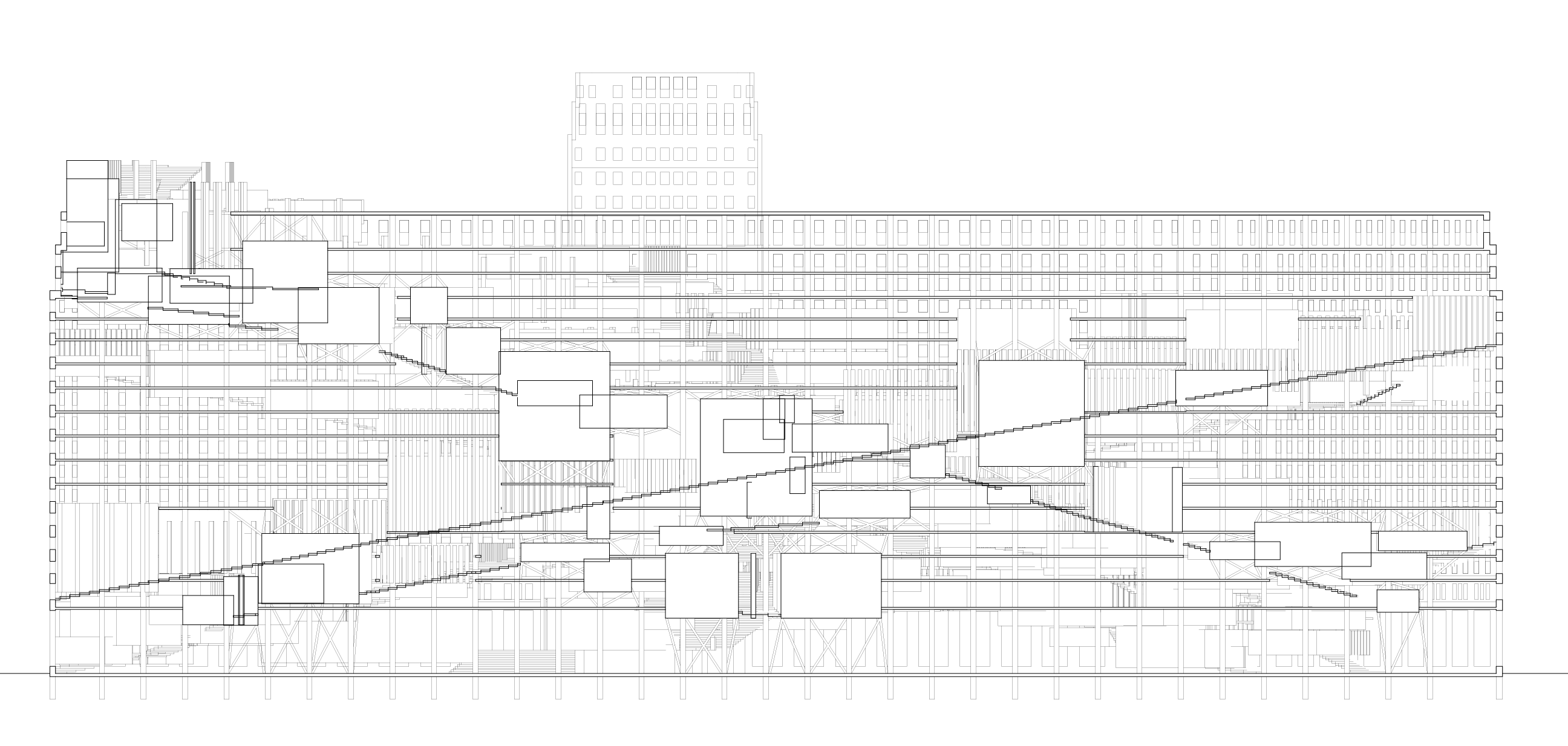 When the prototype was applied to the first case study – merchandise mart – its typological qualities were refined in order to provide a more characterized space. The system not only creates at this point massing and circulation, but also a structurally redundant system of columns that bridges the two and responds to similar parameters. By doing so, the columns now define and differentiate another level of “in-betweeness” within the circulation patterns.