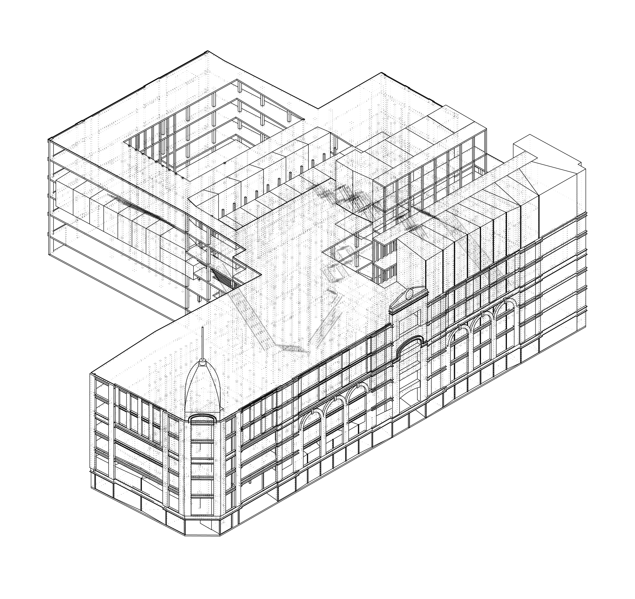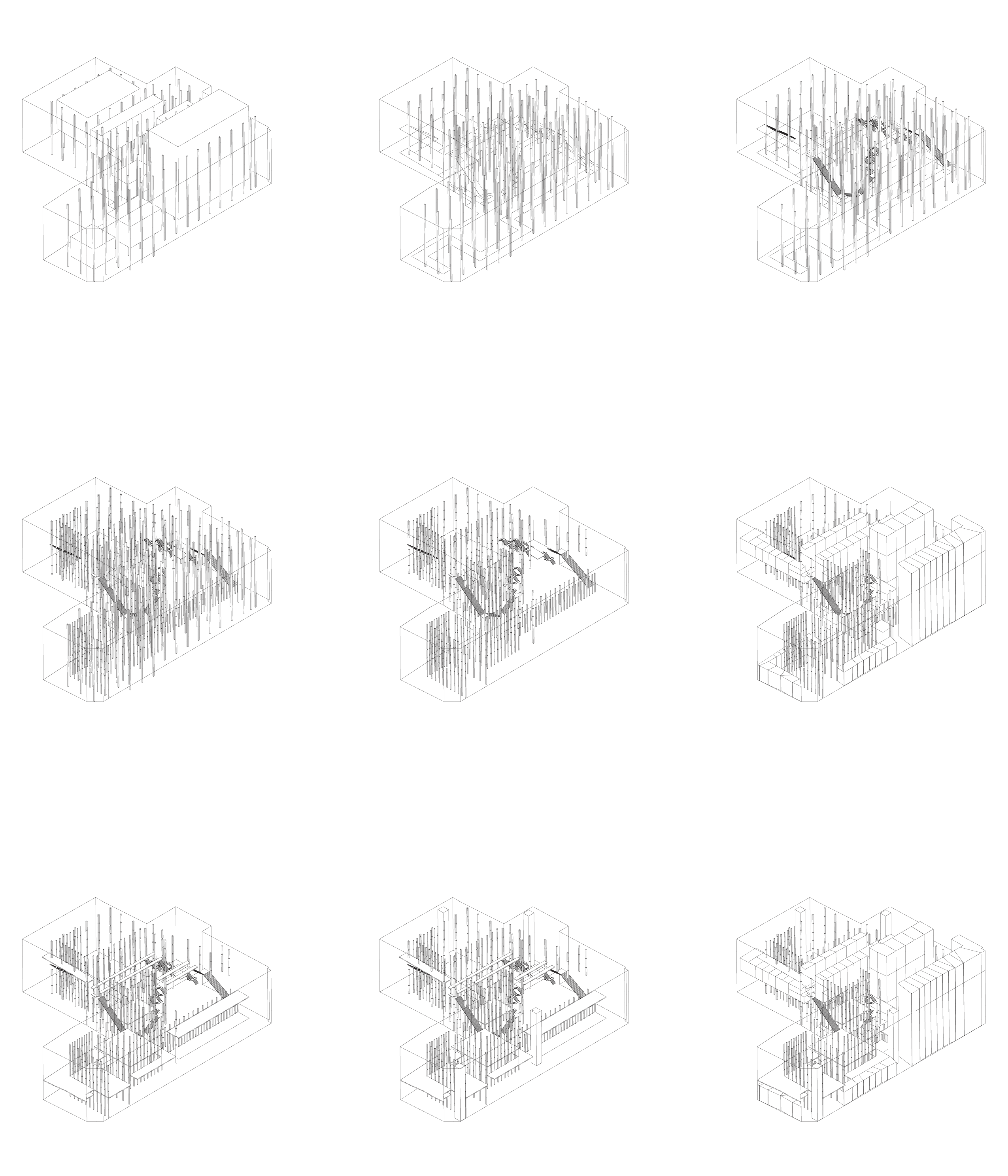 Whereas in Merchandise Mart it all started from generated pathways to occupy the building, this next application took the reverse approach. The spatial field was first differentiated and a basic volumetry defined. Only then was the pathway weaved into the building and the rest of the prototype generated.